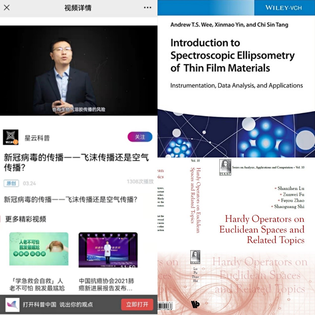 学习强国报道数学系王卿文、杨建生、张琴三位老师联合文章《基于教育数学思想的数学素养培育》。永利集团88304官网数学系赵发友教授及其合作者在国际著名出版社新加坡世界科技出版公司(World Scientific Publishing Company)出版专著: Hardy Operators on Euclidean Spaces and Related Topics,该书属于World Scientific出版社分析、应用和计算系列丛书。永利集团88304官网物理系尹鑫茂教授与新加坡科学院院士Andrew Wee教授等合作者在国际著名出版集团威利(Wiley,世界三大学术出版商之一) 出版专著:Introduction to Spectroscopic Ellipsometry of Thin Film Materials: Instrumentation, Data Analysis, and Applications。纳米中心黄垒老师在科普中国和人民日报客户端等科普栏目发表科普视频,普及病毒生物气溶胶传播原理。