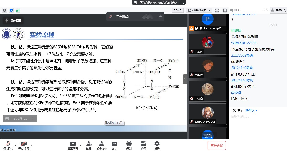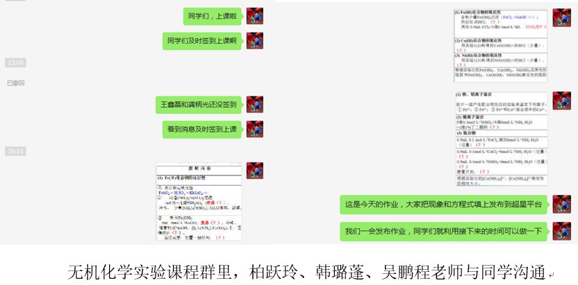 与线下的实验课相比,老师们增加了线上实验课的讲解内容——实验原理、装置、数据及处理方法、使用的软件等。网上实验课考勤严格,力求每位同学做到不缺课、不迟到,大部分课程需要学生提交预习报告。老师在讲解过程中经常对学生进行互动交流,让同学们有参与感、获得感。课后,学生要完成相关实验的现象和反应方程式、实验数据计算,网上提交作业或实验报告。平时,师生常常沟通交流,就课程内容、作业情况等进行深入讨论。