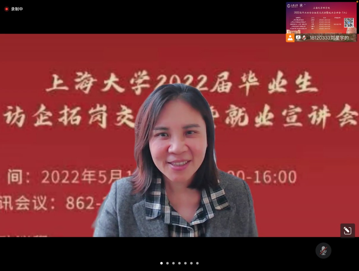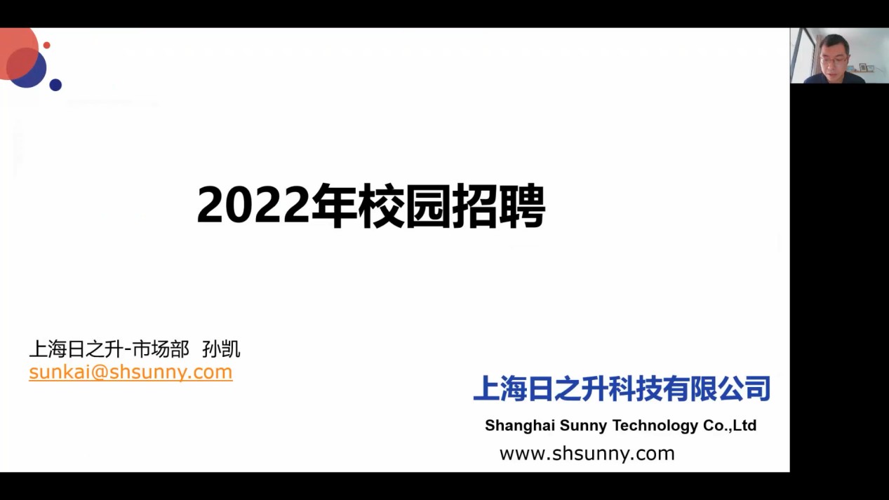 有四家企业参加了下半场的就业宣讲会。上海日之升科技股份有限公司市场部开发经理孙凯从工作场所,工作时间地点,餐补制度,出差安排,劳防用品,公司荣誉多个方面对公司进行介绍,并讲解了公司产品的品类、功能领域、制造过程、应用场所等信息,表明企业在“后疫情”时代承压能力高的特点。最后介绍了企业的招聘岗位、福利待遇,表明了企业具有的开拓视野、人文关怀等优势所在。