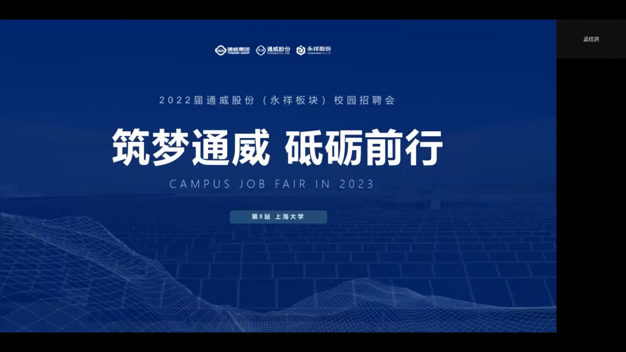 通威股份四川永祥股份有限公司招聘专员孟佳淇从选对行业、找对公司、利于发展三点对同学们的就业选择提出建议,并借此引入光伏发电这一产业以及公司集团简介。她表明光伏发电是现代的绿色产业,具有巨大前景,而永祥股份则是生产高纯晶硅的龙头公司,是光伏产业的代表。最后她还从成长性、获得感、幸福感三个方面,介绍公司所具有的优势。