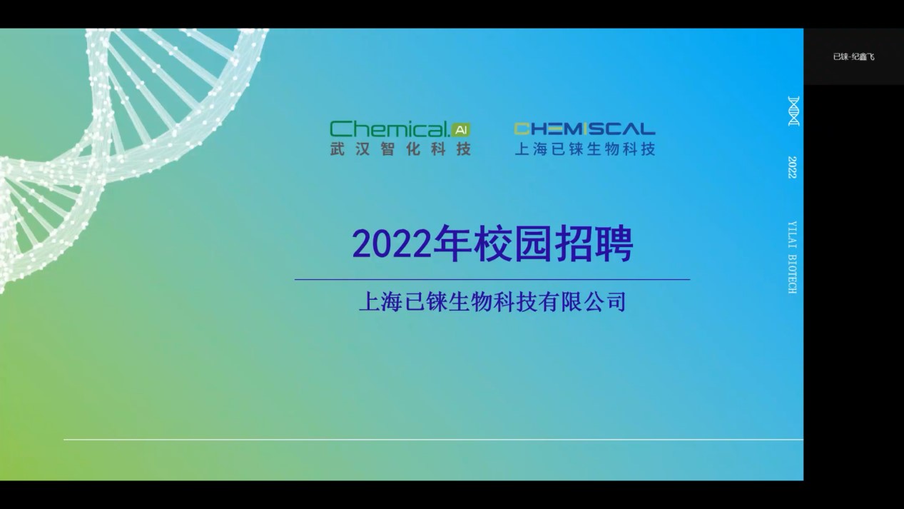 随后上海已铼生物科技有限公司有机合成高级研究员纪鑫飞从公司的核心项目——人工智能在医药研发的应用开始介绍,表明这已成为时代热点项目,并指出了智能化学合成的必要性。他对公司的核心技术进行讲解,表明了公司在化学合成上的优势。最后介绍了员工福利、工作环境、专业要求、晋升通道、招聘流程等。