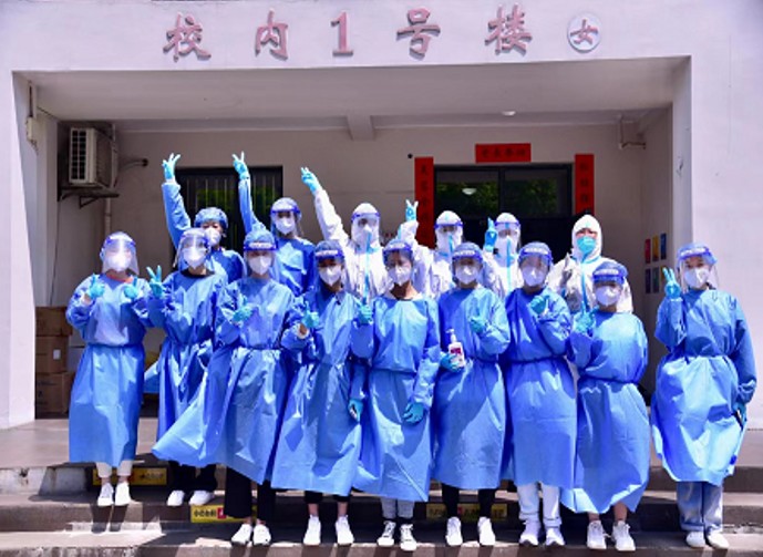 闻令而动当先锋,抗疫一线党徽亮。雷云逸老师白衣为甲、披荆斩棘,守护着深爱的校园。她让党旗高高飘扬在抗疫一线,用胸前熠熠的党徽昭示了战胜疫情的勇气决心。这场疫情攻坚战中,像她一样的党员师生还有很多,让我们向她们致以最崇高的敬意和最衷心的感谢!战役胜利冲锋的号角已吹响,让我们齐心协力,做好常态化疫情防控,期待来日重逢于美丽的校园。