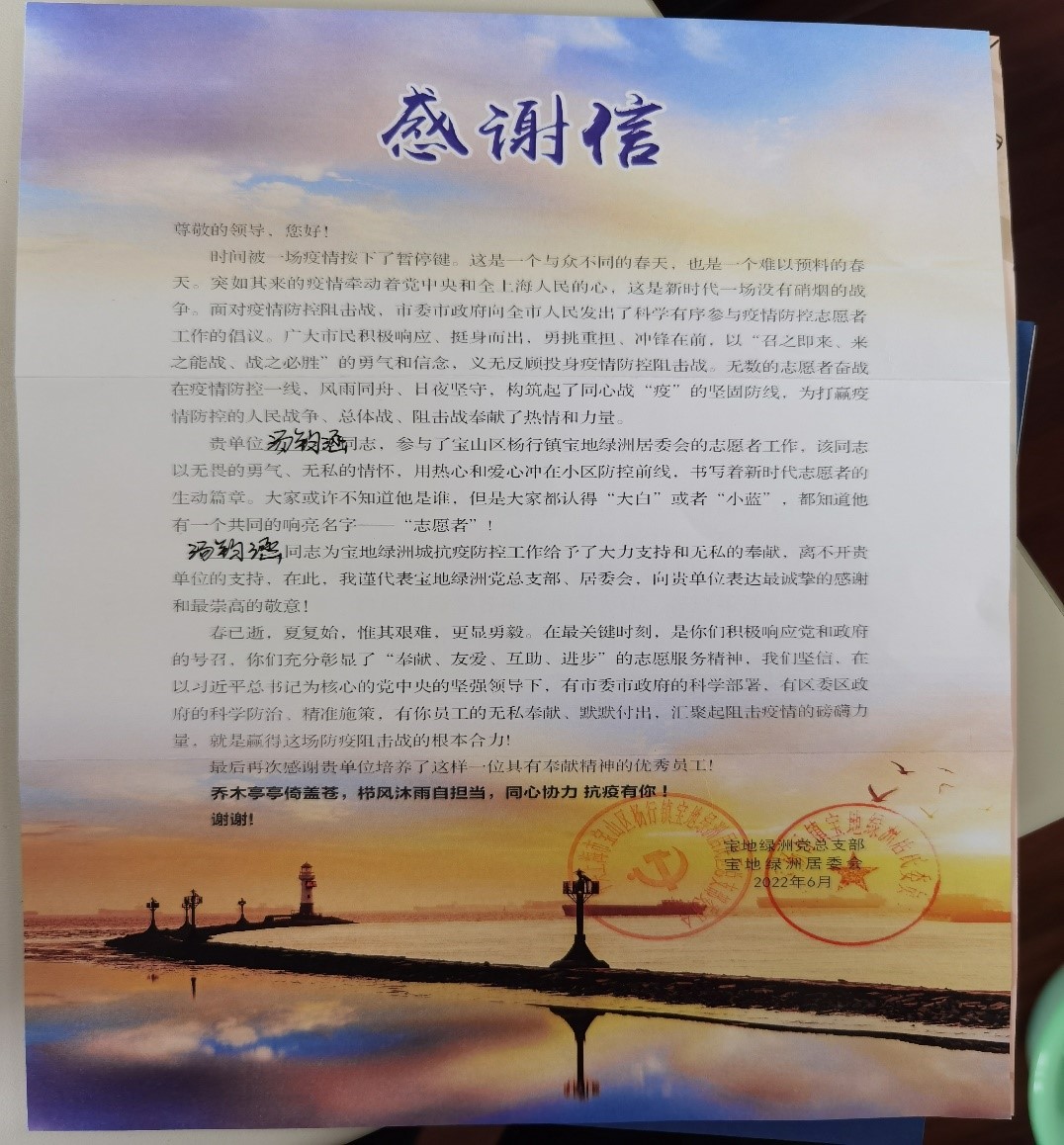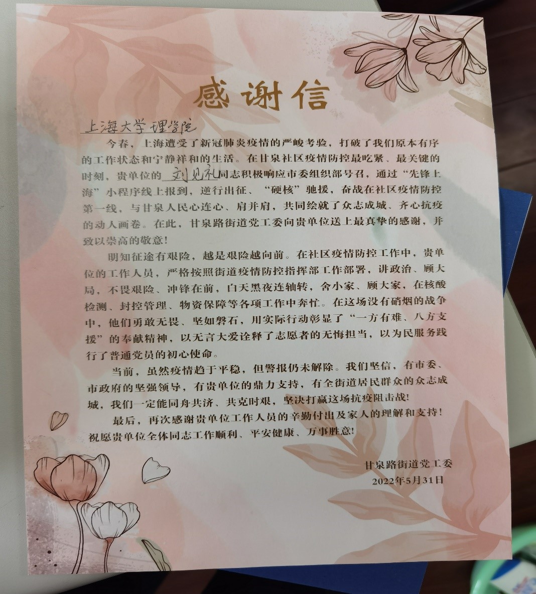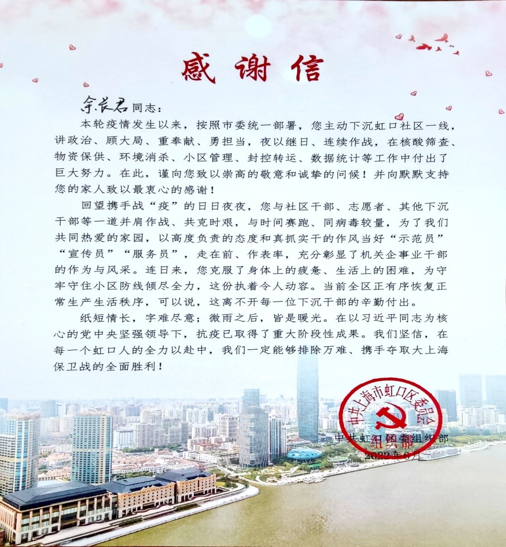 上海疫情面临严峻考验之际,永利集团88304官网各级党组织和党员同志闻令而动、召之即来,积极响应市委组织部号召,在“先锋上海”小程序线上报到,连续奋战在属地社区抗议一线,积极协助居委承担核酸筛查、生活保障等志愿服务工作,充分彰显了永利集团88304官网党员识大局、明责任、讲担当、肯付出的精神品质。对于疫情期间的无私奉献,学院多位党员诸如刘见礼、余长君、汤钧涵等同志也收到了来自属地政府部门的感谢信。