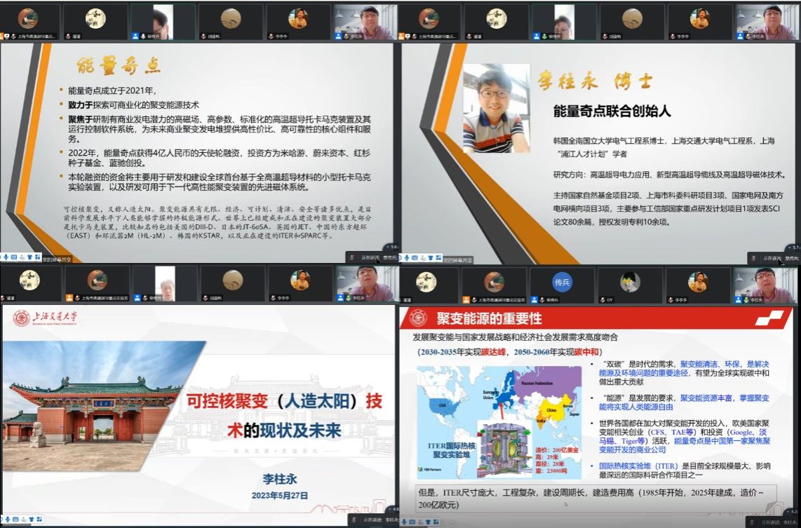 专家讲座环节特邀超导磁体及电力应用专家李柱永研究员为大家带来“可控核聚变(人造太阳)技术的现状及未来”的报告。李柱永系韩国全南国立大学电气工程系博士、上海交通大学电气工程系“浦江”学者,同时也是能量奇点联合创始人,致力于研制有商业发电潜力的高磁场、高参数、标准化的高温超导托卡马克聚变能源装置,为未来商业聚变发电堆提供高性价比、高可靠性的核心组件和服务。报告介绍了磁约束聚变堆的基本原理及基于全高温超导材料的小型托卡马克实验装置的研发进展。内容深入简出,丰富精彩,引起了广泛关注和热烈讨论。