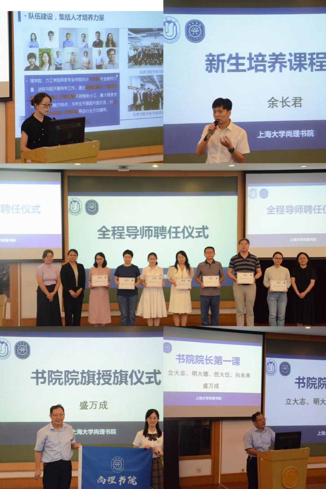 书院院长盛万成将院旗授予23级新生同学,并叮嘱秉承“厚基 博学 开放 创新”的院训精神,不断努力,紧接着为尚理书院全体新生带来“立大志,明大德,担大任,向未来”为专题的院长第一课。全面、生动又深刻地讲述了当今时代,人才对于国家、社会、各行各业发展的重大作用和意义。大学生除了以学为重,同时也要有志向,高尚的情操,希望同学们铭记时代使命,不负“请党放心,强国有我”的誓言,祝愿所有书院新生踏上绚丽之旅,开启美好生活!