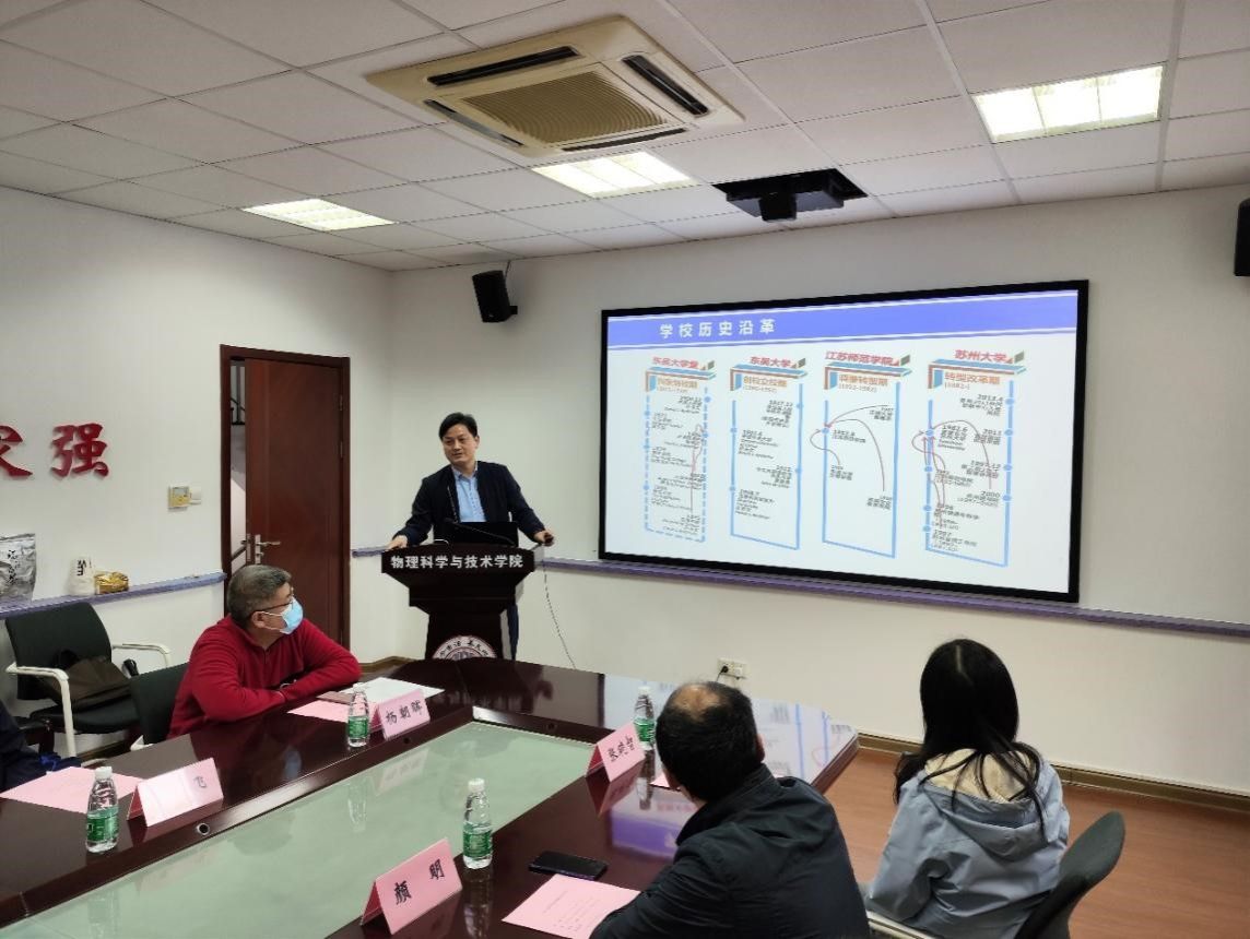 为深入学习贯彻习近平总书记重要讲话精神,把“牢记嘱托、感恩奋进、走在前列”转化为推动教育实践高质量发展的实际行动,学习深化高校物理学科教育改革优秀成果与先进做法,11月10月,由永利集团88304官网党委书记盛万成、副院长戴晔带队,永利集团88304官网物理系党总支班子成员及教师代表一行到苏州大学物理科学与技术学院开展调研座谈。苏州大学永利集团88304官网党委书记杨礼富、副院长赵承良、副书记、副院长谢燕兰及各研究所及中心负责人和教师代表等共同出席调研座谈会。