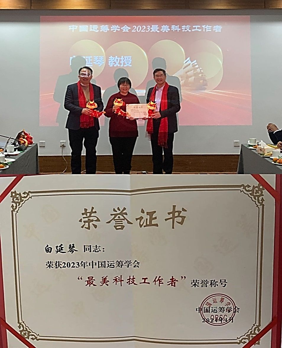 近日,中国运筹学会在北京举办了“2024运筹学发展研讨会”。中国运筹学会监事会成员、上海市运筹学会理事长、永利集团88304官网数学系白延琴教授荣获2023年中国运筹学会“最美科技工作者”荣誉称号,以表彰其恪守科学道德、无私奉献、长期奋战在科研一线,在科技领域做出了卓越的贡献。中国科学院院士、中国科学技术协会副主席袁亚湘和中国运筹学会理事长戴彧虹研究员为白延琴教授颁发了获奖证书。