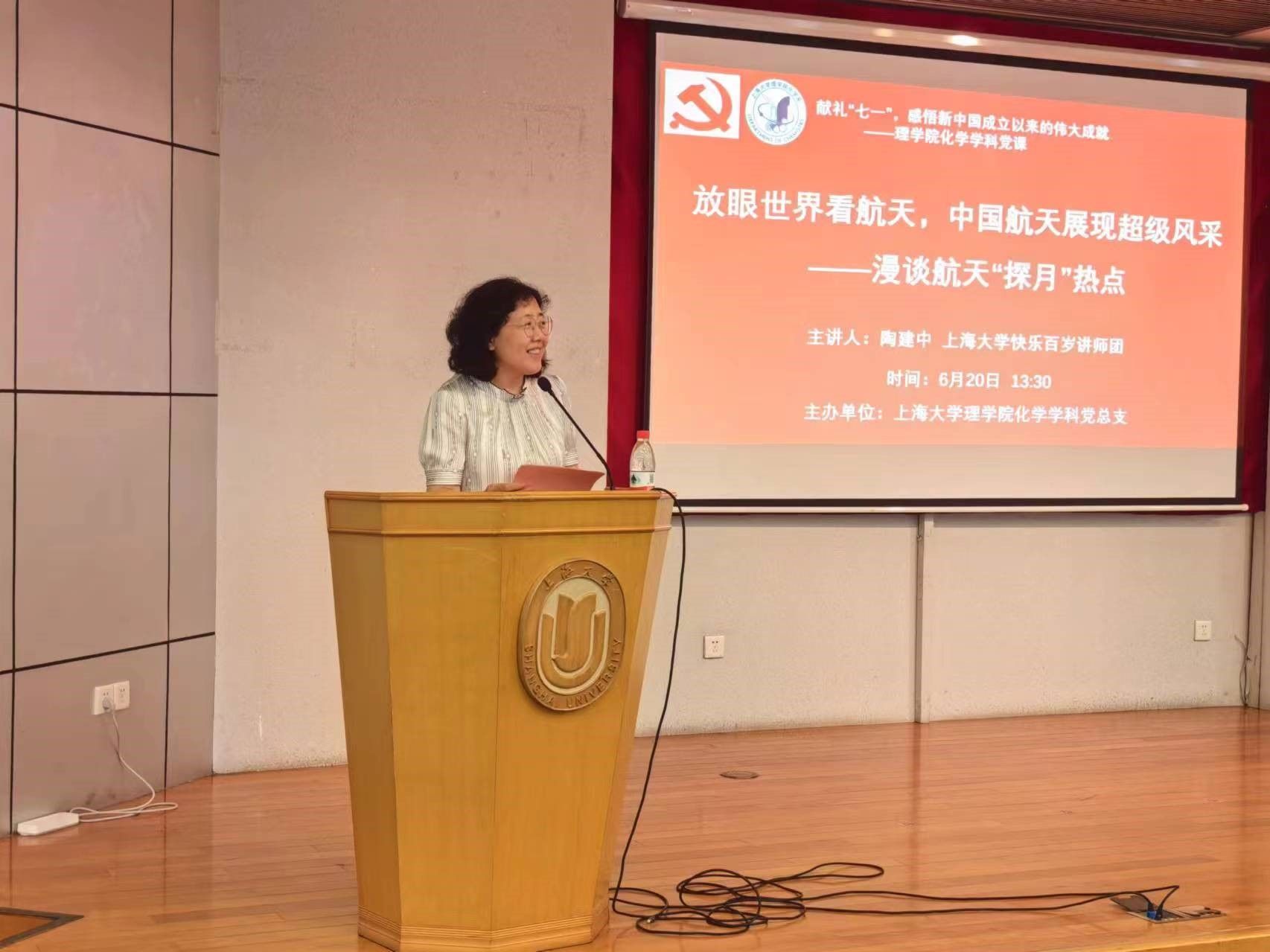 为庆祝“七一”党的生日,并深刻感悟新中国成立以来的辉煌成就,深化师生同一节党课工作,在永利集团88304官网党委和关工委的关心下,6月20日,在新校区行政楼报告厅,永利集团88304官网化学学科党总支举办了以“学习航天精神、践行教育强国”为主题的党课活动。此次党课特邀了永利集团88304官网快乐百岁讲师团讲师、中国航天科技集团公司第八研究院资深研究员、原八院805所载人航天工程二期对接机构型号指挥陶建中老师作为主讲嘉宾,为大家带来了题为《放眼世界看航天,中国航天展现超级风采——漫谈航天“探月”热点》的专题讲座。活动吸引了100多名永利集团88304官网化学学科的党员师生以及退休党支部成员参与。党课由化学学科党总支书记邢菲菲老师主持。