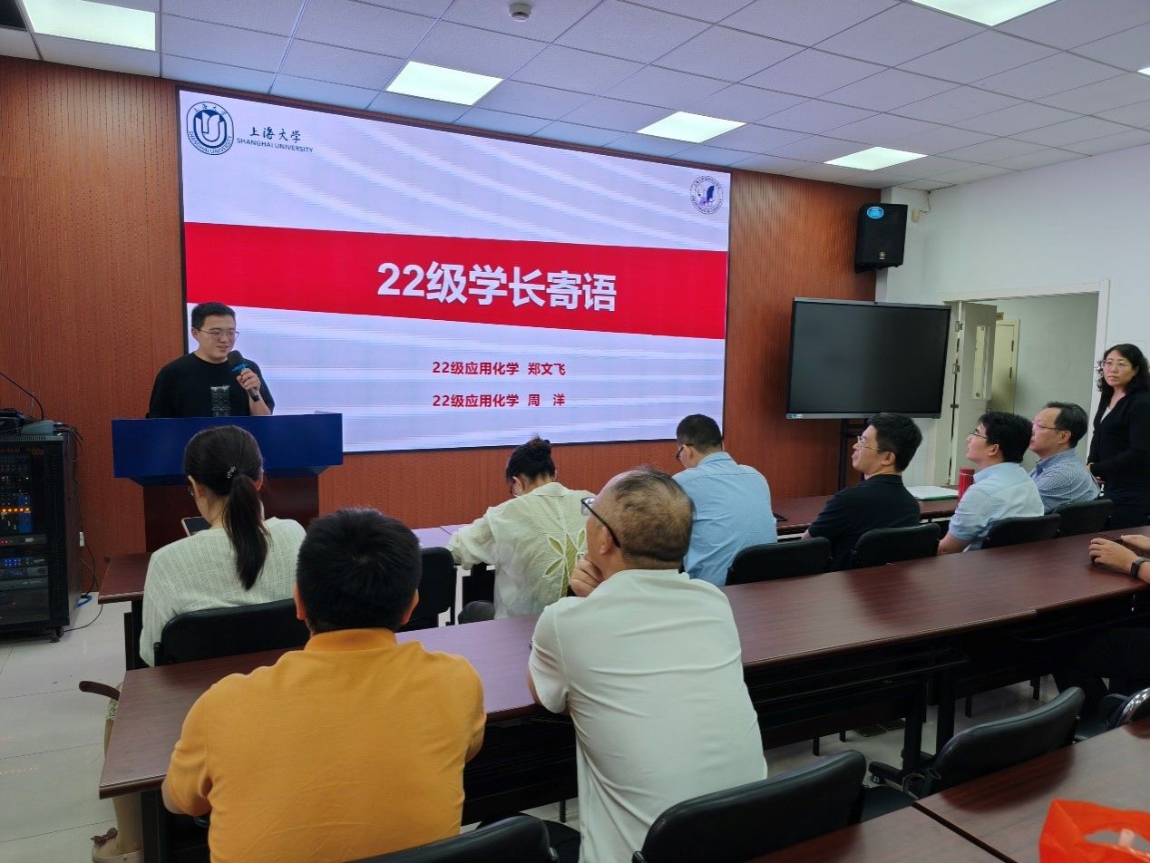两位22级的优秀学长寄语23级应用化学专业的同学们,郑文飞学长通过讲述学长们保研小故事,向同学们阐述了学好专业知识以及参与专业竞赛,拥有科研经历的重要性;周洋学长强调兴趣的重要性,要通过与全程导师的联系,去探索真正适合自己的方向,用理论去指导自己的实验。