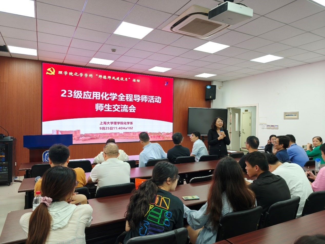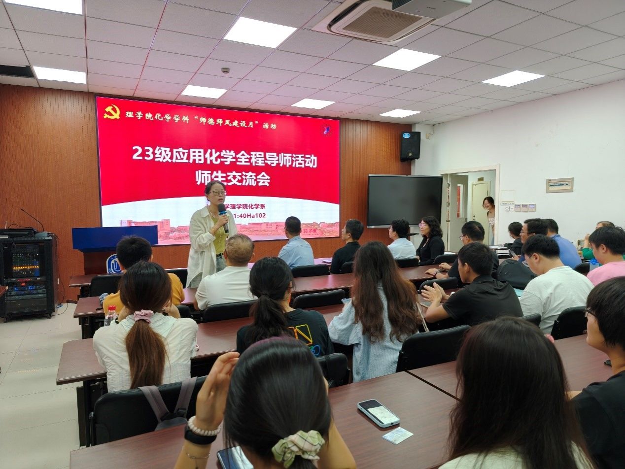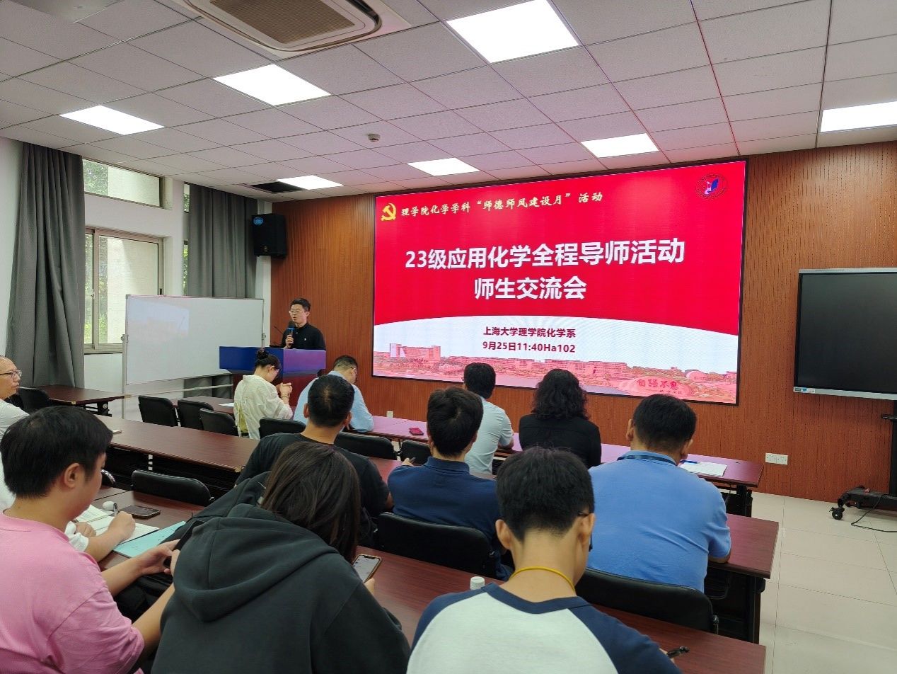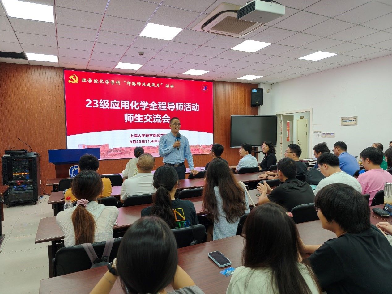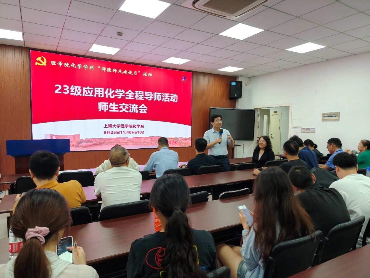 9月25日,永利集团88304官网化学系在宝山校区HA102举办了23级应用化学全程导师师生交流会。永利集团88304官网党委书记于瑞强,永利集团88304官网党委副书记、纪委书记刘见礼,永利集团88304官网党委副书记、副院长姚颖冲,化学学科党总支书记邢菲菲,化学系主任李健,化学系副主任洪玲,化学系副主任赵宏滨,化学系副主任丁益民,化学学科党总支副书记、辅导员林晨亚,化学系全体23级全程导师莅临此次交流会活动。本次见面会由林晨亚主持。