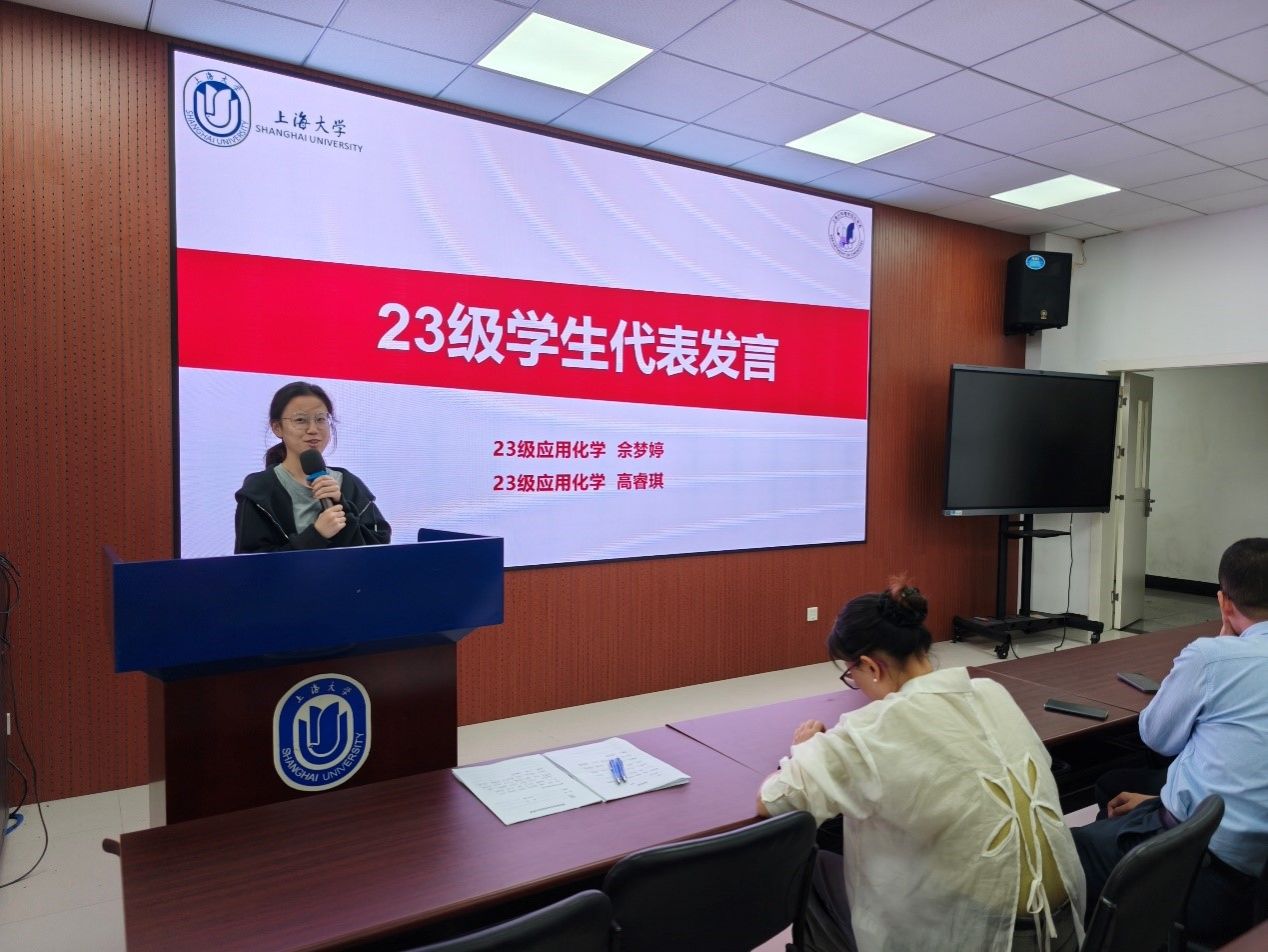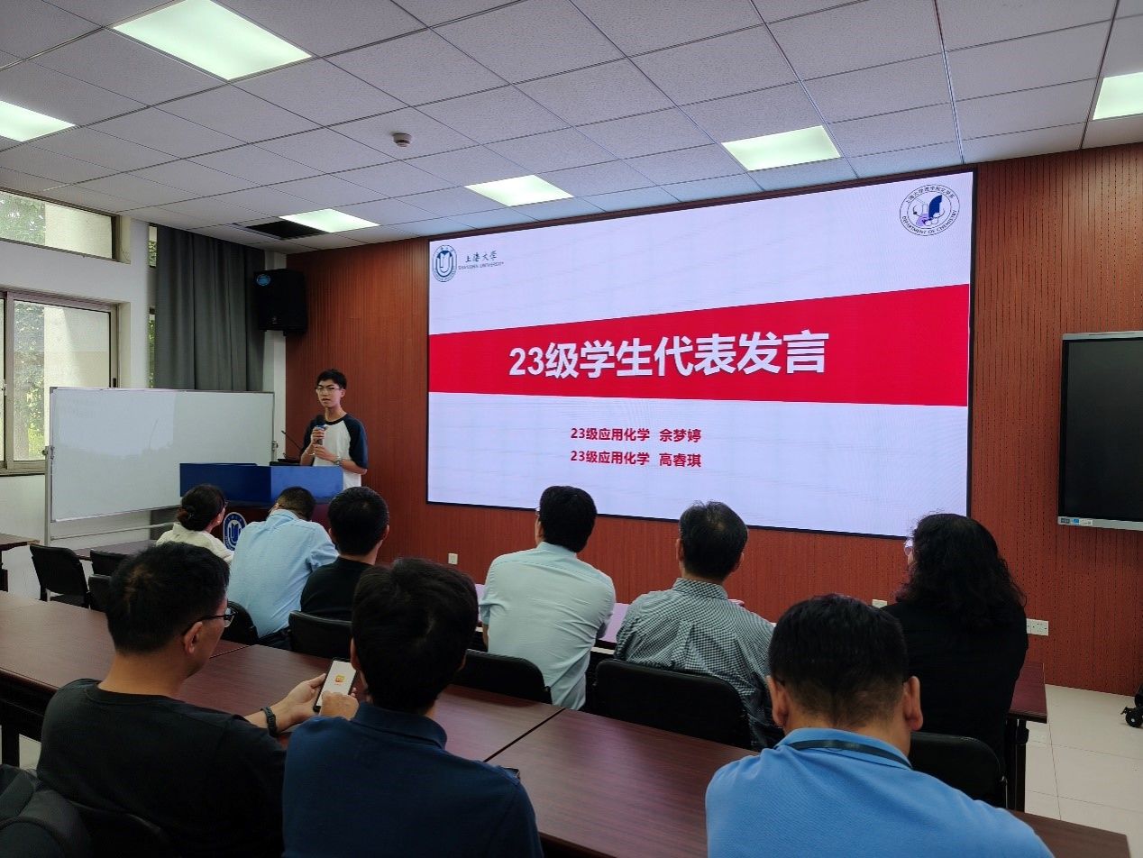23级学生代表佘梦婷、高睿琪分别从自己学习了解化学专业的过程,以及和全程导师的互动两个方面讲述了自己进入应用化学专业以来的经历,鼓励同学们敢于树立目标,主动探索未知,不断充实自己的学习生活。