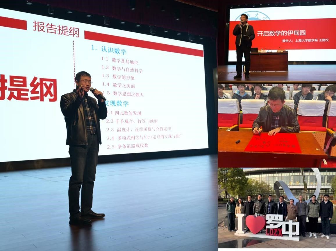 随后,王卿文在罗店中学大礼堂为高一高二学生带来一场精彩报告。王卿文以 “开启数学的伊甸园”为题,用幽默语言、生动案例带领学生走进数学世界。他通过实例展现数学在生活与科技中的应用,鼓励学生打破畏难心理。报告结束后,他在留言簿写下“让数学变容易”,寄语学生感受数学思维的乐趣。
