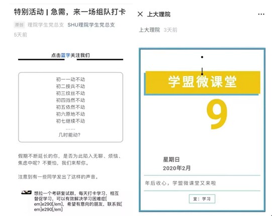 疫情当前,我院党委坚持“一切工作到支部”的工作导向,研究生20个党支部与本科生3个党支部正切实担负着直接教育、管理、监督党员和组织、宣传、开展凝聚、服务师生群众的职责,增设“一心向学,笃志创新”数学系本科生临时党支部和“疫情当前,党员在前”研究生临时党支部,搭筑战疫安全防线。在各党支部的引领下,开展疫情防控线上主题党日活动,学习习近平总书记关于疫情防控工作的重要指示精神,学习《中共中央组织部关于坚决贯彻落实习近平总书记重要指示精神在打赢疫情防控阻击战中积极主动履职有效发挥作用的通知》、《教育部致全国大学生的一封信》等。党员带头开展大型线上组队打卡,成立临时学习小组、“武汉加油!中国加油!”送祝福、观看有关传染病纪录片、疫情知识答题、众志成城抗击疫情故事征集,挖掘党员典型事例。