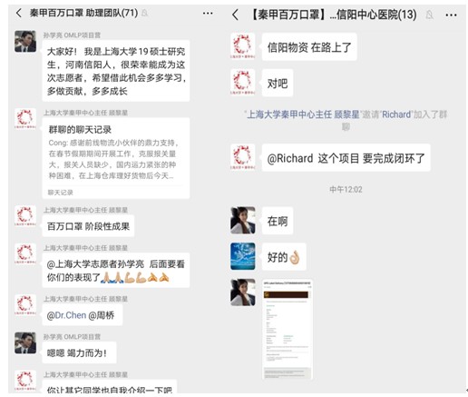 由李丽媛等9名党员组成的“疫情当前,党员在前”研究生临时党支部,第一时间响应校友顾黎星发起的“NP0百万口罩项目”,依托上大秦甲中心,与上海科委相联通,参与救援物资对接工作,物资投放辐射湖北、河南、湖南等10余个省份,志愿团队累积工作时长超5000小时,每日人均工作时长超10小时。在团队党员的感召下,来自河南信阳重灾区的19级化学系入党积极分子孙学亮,在秦甲中心的帮助下,已为信阳当地医院募得近2.5万元救援资金,救援物资现已发往当地医院。