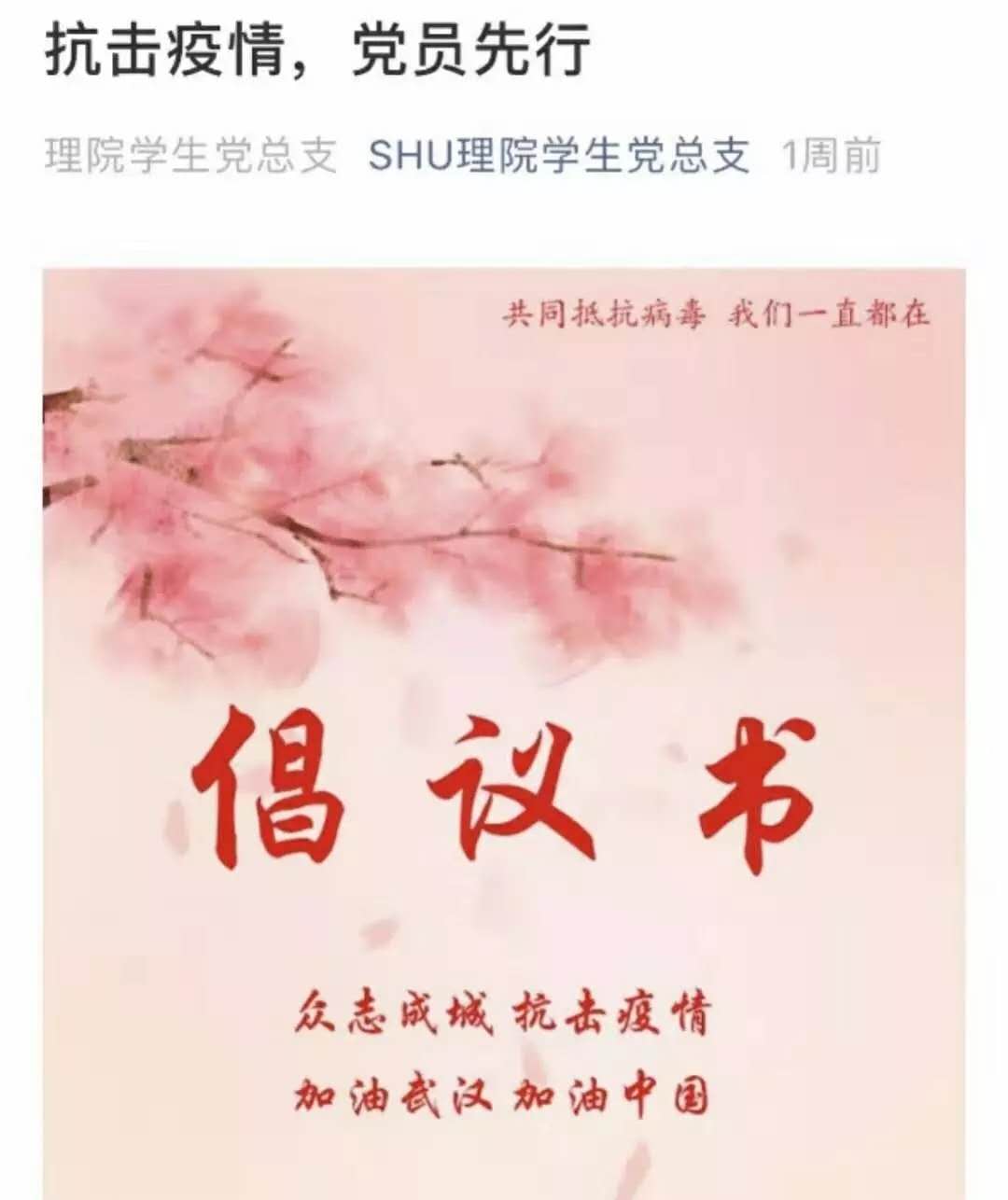 2月3日,教育部发出致全国大学生的一封信,信中写道:每一位同学都牵系一个家庭,每一个青年应担当一份使命,自觉做科学的传播者、谣言的粉碎者、健康的守护者、家庭的关爱者。”在新型冠状病毒防控工作中,身处在全国各地的党员们也即刻行动,他们或服务师生、或志愿服务、或爱心奉献,让初心使命在这场战疫中闪闪发光。程洁等5名党员自愿缴纳特殊党费,为打赢本次战疫贡献自己的力量。我院俱李菲、钟玉义等10名研究生党员参与本地区隔离防护、道口查控以及上门巡查等防控相关工作,彰显永利集团官网研究生的担当。吴中梅、王晶洁等35名学生干部,协助上大校友顾黎星,依托上大秦甲中心,参与救援物资对接物资,现已辐射湖北、湖南、江西等多地医院、红十字会。虽然有些同学不能投入抗疫战争,但范文斌等同学他们以笔为枪,与全国各地音乐人在线协作,用旋律书写抗击疫情的赞歌,引导广大青年弘扬正能量,在这场全民战争中紧随党的步伐,增强大学生的使命担当,凝聚力量,共克时艰。