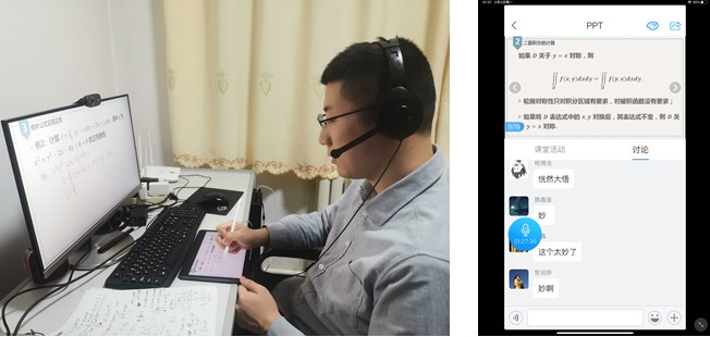 答:作为一名共产党员,同时也是一名具有丰富线上教学经验的“主播”,在这样一个特殊时期,我有极大的热情投入到线上教学的各项工作中,也积极同其他老师交流,以求达到更好的效果。线上教学与教室授课相比有很多区别,比如说优点在于不受地理位置、教室容量的限制,可以反复观看,但同时也有一些缺点,比如板书效果大打折扣,这对于数学课还是很重要的。目前我是采用平板电脑和手写笔来代替板书,尽可能的提升同学们的学习体验。同学们的反馈总体来讲还是很满意的。