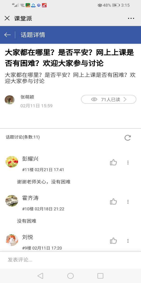 今年因为疫情,不得不改为网络教学。这对于习惯在这学期采用板书教学、喜欢和学生互动的我来说,是一个不小的挑战:重新整理PPT、面对没有回应的PPT录课。其实对于目前录制的课程并不是特别的满意。但时间紧、内容多,也只能尽量调整。包括不断尝试如何有效与学生互动、如何评估学生学习后的真实效果,我相信老师们都在不断尝试和改进。或许这些做法并不符合慕课(网络教学)应有的样子,但是感恩的是,这是非常时期,我们能与学生一同去努力的事。而我也欣喜地发现,这样的方式也有不少好处。原来对学生们最大的担心,是他们自学能力和主动学习的意识比较薄弱,而特殊时期的网络教学,恰恰逼着他们自主学习。有的同学已经开始找到门路,而有些同学还在摸索,有些同学还在犹豫和等待。而我也在学习在教学这件事上适当放手,给学生们的自主学习留出空间,并在恰当的时候给予引导和反馈。