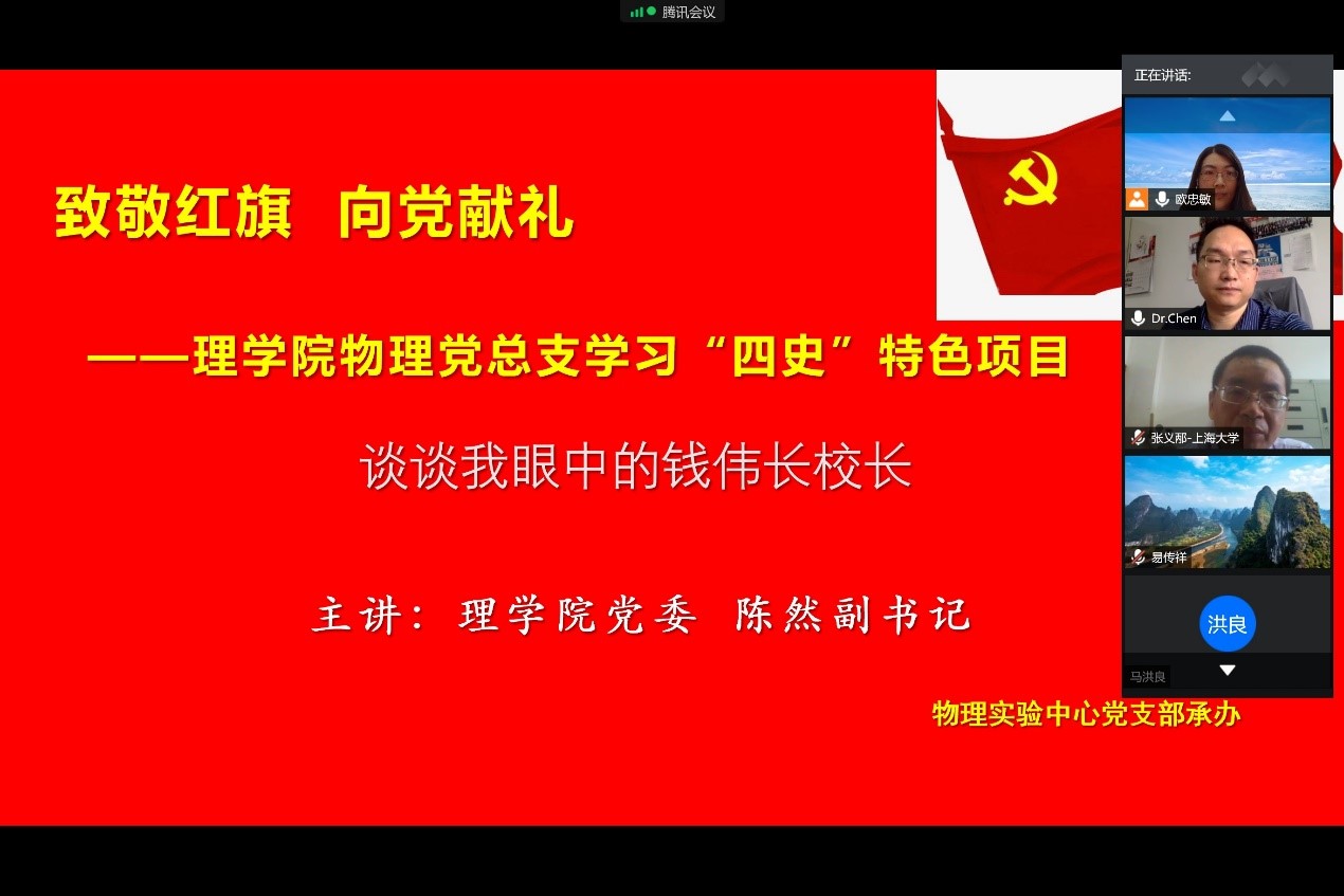 6月23日上午,物理系物理实验中心党支部通过“腾讯会议”召开了一次别开生面的线上支部生活,会议特别邀请了永利集团88304官网党委副书记陈然博士为主讲嘉宾,以《学四史·知校情·忆校史——浅谈学习钱伟长教育思想的体会》为主题,进行“四史”学习,会上陈然老师向支部成员分享了钱伟长老校长治校治教治学的生动故事和的矢志不渝的爱国情怀。