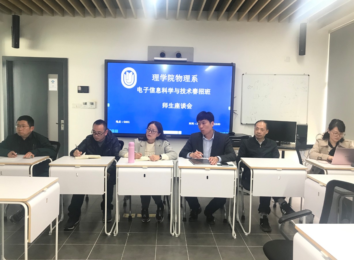 4月16日下午1点G601会议室,永利集团88304官网物理系电子信息科学与技术专业春招班师生座谈会举行,出席本次师生座谈会的有永利集团88304官网党委副书记姚颖冲、永利集团88304官网副院长余长君、物理系党总支书记颜明、物理系副主任张爱林、物理系辅导员周青利。本次师生座谈会目的在于了解同学们在学习过程中遇到的问题、收集同学们对于春招班课程设置以及课程安排等方面的意见和建议。