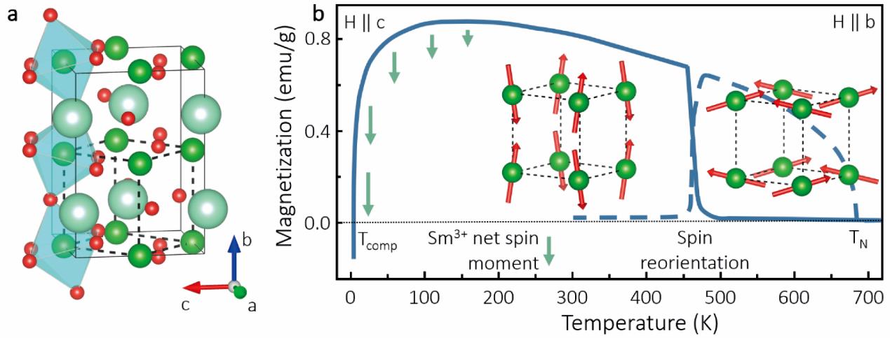图1 SmFeO3晶体结构和随温度变化的磁性能。 a)稀土正铁氧体Pnma结构:氧、铁和稀土离子分别以红色、绿色和青绿色给出,FeO6八面体为淡蓝色。b) 磁化强度的演变:在奈尔温度以下,Fe离子自旋有序为AxFyGz型。 在自旋重取向时,磁有序转变为CxGyFz反铁磁构型的自旋倾斜导致净磁化。 在低温下,Fe子晶格的磁性诱导Sm离子磁性子晶格,其净磁矩(箭头)与铁离子磁性子晶格的磁矩反向平行,导致磁化补偿点在3.9 K。