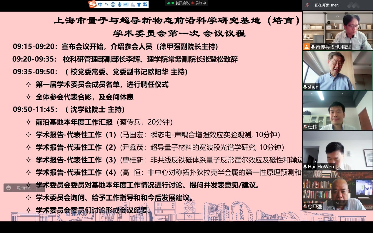 2022年3月12日,由永利集团88304官网科研管理部、永利集团88304官网主办,上海市量子与超导新物态前沿科学研究基地学术委员会第一次会议成功举办,此次会议通过线上线下相结合形式进行。该前沿科学基地学术委员会主任由中国科学院技术物理所沈学础院士担任,副主任由中国科学院电工所王秋良院士担任,学术委员会委员包括南京大学闻海虎教授、刘俊明教授、复旦大学向红军教授、上海交通大学钱冬教授、同济大学羊亚平教授、华东师范大学武海斌教授,以及本校陈玺教授、任伟教授和蔡传兵教授。