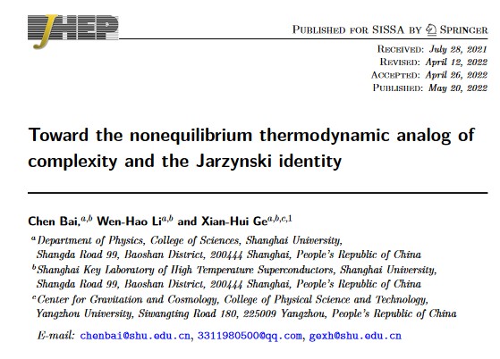 近日,在物理系葛先辉教授指导下,应用物理学专业两名本科生柏辰、李文浩在量子复杂度研究方面取得重要进展。成果以题为“Toward nonequilibrium thermodynamic analog of complexity and Jarzynski identity”的论文发表在国际著名期刊《Journal of High Energy Physics》上。物理系本科生柏辰和李文浩分别为为论文第一作者和第二作者,葛先辉教授为论文通讯作者。