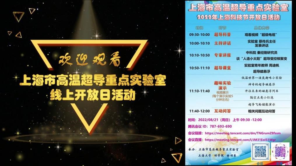 2022年8月21日,永利集团88304官网上海市高温超导重点实验室举办了2022年上海科技节“走近超导”开放日活动,此次活动通过腾讯会议及同步直播两种形式于线上进行,实验室面向广大社会公众开展了专家讲座、超导课堂及趣味视频演示等一系列活动。