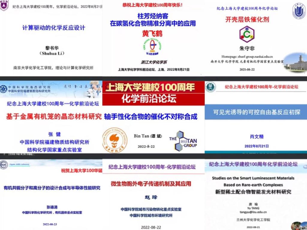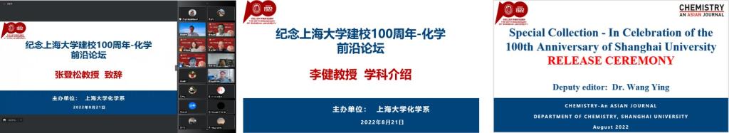 十秩春秋、薪火相传、百年上大、笃行不怠。化学学科纪念永利集团88304官网建校100周年系列活动之一“化学前沿论坛”于近日在线上成功举办。来自国内高校和科研院所的25位知名学者为化学学科的广大师生带来了一场场精彩的前沿学术报告。论坛的举办旨在加强化学学科前沿学术交流,拓宽师生的创新思维和学术视野,搭建高层次科研合作平台,助推学科建设和人才培养,共谋化学学科新发展。论坛开幕式期间,Willey旗下《Chemistry-An Asian Journal》纪念百年上大的专刊正式发布。