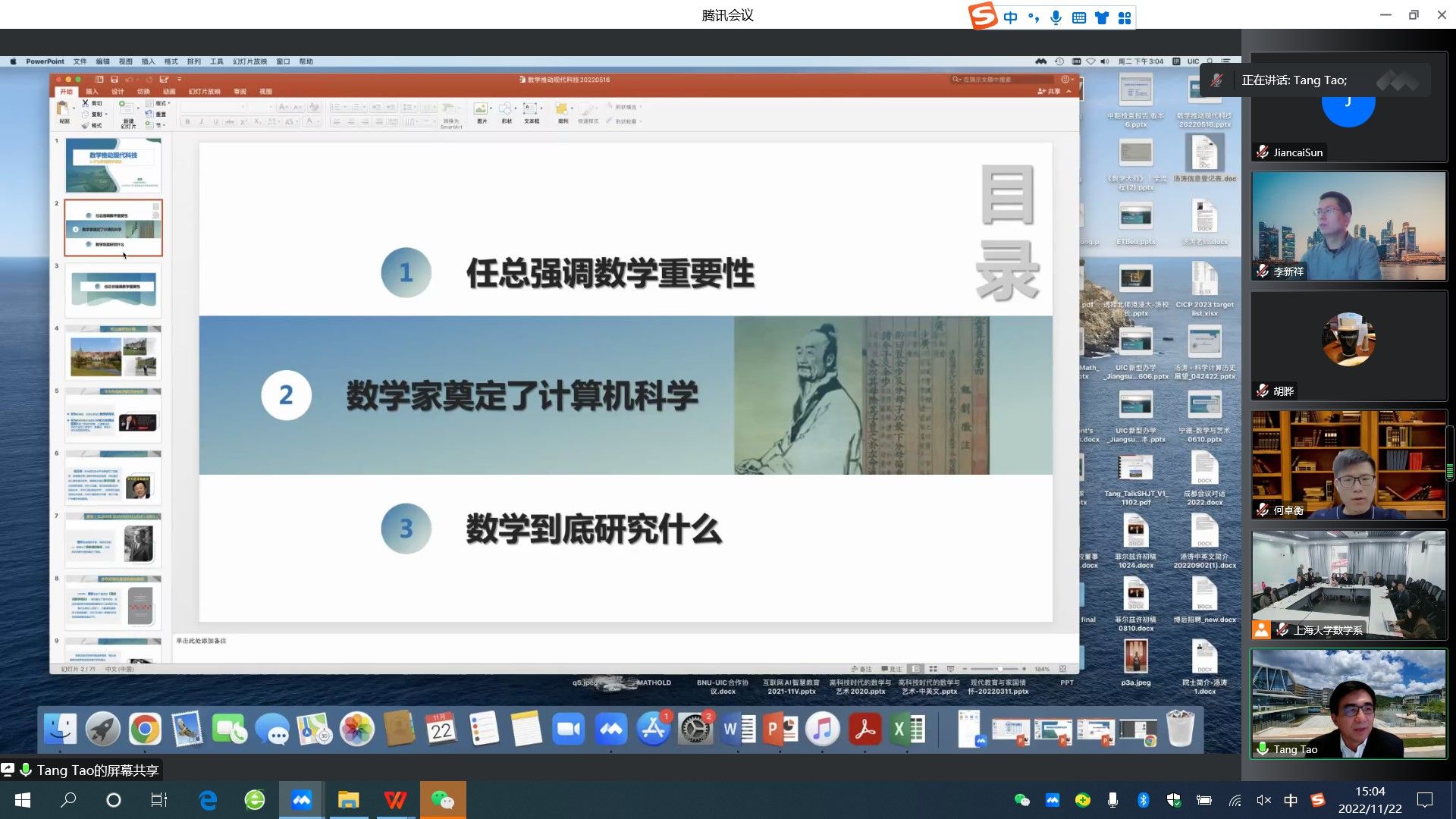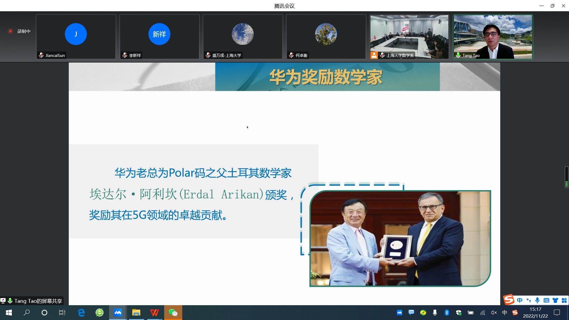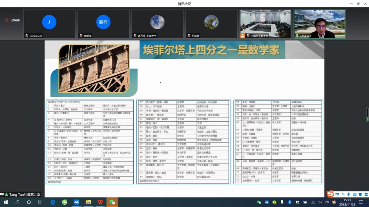 数学与国民经济中的很多领域休戚相关,其中互联网、计算机核心算法、图像处理、语音识别、云计算、人工智能、5G等IT业主要研发领域都是以数学为基础的。为提升师生科学素养和文化素养,永利集团88304官网当代科学前沿讲坛第266讲特邀中国科学院院士汤涛,于11月22日下午作了题为“数学推动现代科技--从华为重视数学谈起”的线上报告。本次报告由永利集团88304官网党委书记盛万成教授主持,永利集团88304官网数学系班子成员、骨干教师及尚理书院学生共200多人线上线下参加了报告。