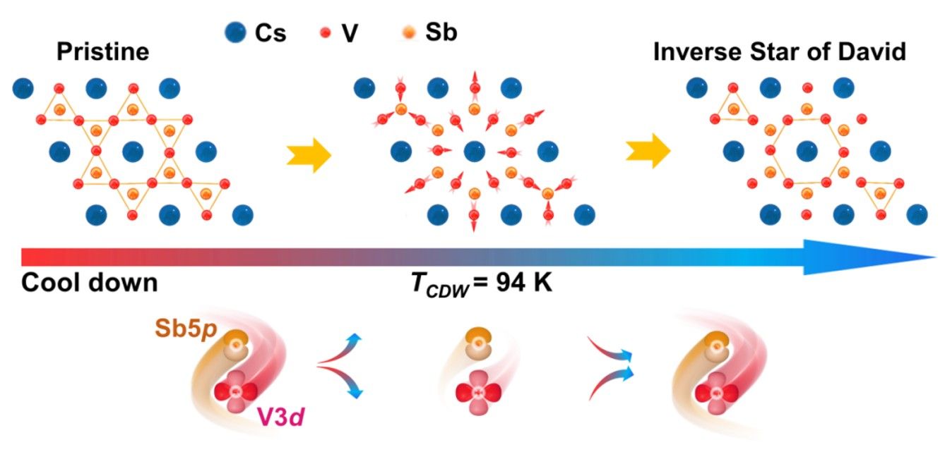 在这篇最新论文中,尹鑫茂教授团队通过先进光谱技术-同步辐射变温X射线吸收光谱和第一性原理计算相结合的方式,首次提出了轨道杂化效应是Kagome超导体中产生CDW量子相变的驱动因素,探索了CDW的物理起源,并确定了AV3Sb5的CDW基态结构。由于V3d-Sb5p轨道杂化的驱动作用,V原子在CDW相变温度(TCDW=94 K)附近发生位移,最终晶格由原始相(Pristine)转换为逆大卫星(Inverse Star of David)结构。这一结果突出表明了Sb原子轨道在相变中所起到的关键作用,是识别Kagome超导体中量子相变关键因素的重大突破,对一系列后续研究有启发作用。该团队从轨道耦合的角度对CDW量子相变过程进行了创新性地探讨,为其他非常规量子态的轨道起源提供了新的探索性见解,同时也为进一步揭开超导态与其他有序态之间的竞争及互补机制提供了新契机。