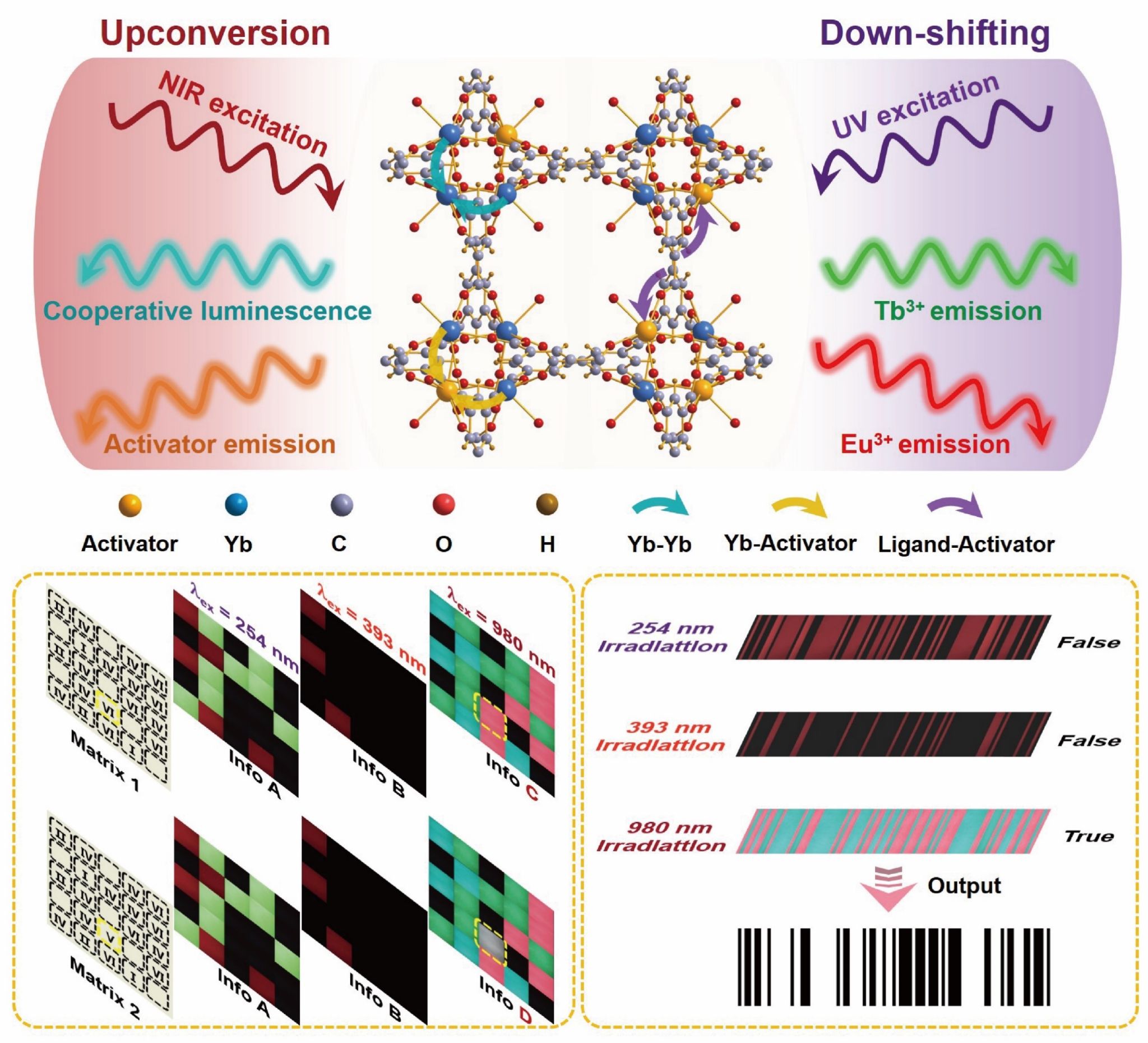 永利集团88304官网化学系孙丽宁教授课题组通过多年来在稀土发光领域的研究经验和积累,成功发展了一系列具有多模发射性能的稀土金属有机框架,其在紫外光照射下能够分别发射出源于Eu3+和Tb3+的红色和绿色发光;同时,在980 nm近红外光的照射下,该系列稀土金属有机框架能够显示出Yb3+的青色上转换合作发光和分别来自稀土激活剂(Eu3+、Tb3+或Ho3+)的特征上转换发光。此外,Yb3+和Ho3+共掺杂的稀土有机框架,当Ho3+掺杂浓度为1%时,其令人惊喜地表现出近白色的上转换发光。该团队利用这一系列稀土金属有机框架的优异多模发射性能,成功地进行了光信息存储与加密的应用研究。
