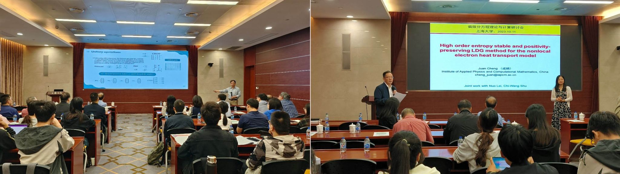 本次会议邀请了上海交通大学金石教授、北京应用物理与计算数学研究所成娟研究员分别作了题为“Quantum Computation Of Partial Differential Equations”和“High order entropy stable and positivity-preserving LDG method for the nonlocal electron heat transport model”的特邀报告。