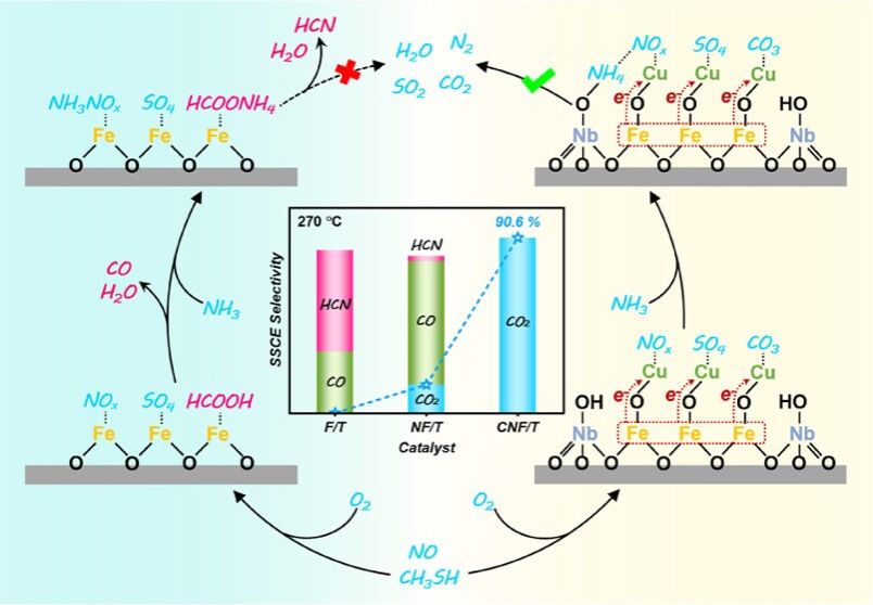 永利集团88304官网碳中和创新研究中心张登松教授团队通过在TiO2负载的Cu改性Nb-Fe复合氧化物催化剂上构筑的深度氧化位点实现了选择性协同催化消除NOx和CH3SH,该催化剂具有优秀的NOx和CH3SH催化去除性能,并拥有优异的N2和CO2选择性。作者结合XPS、原位拉曼光谱和原位漫反射红外光谱表征,阐明了从Nb-Fe复合氧化物到Cu氧化物的持续的电子转移诱导生成了催化剂表面深度氧化位点。该位点可以将毒副产物CO的前驱体HCOOH深度氧化为CO2,从而避免HCOOH进一步和NH3结合生成毒副产物HCN的前驱体HCOONH4(图1)。本工作对大气污染控制领域NOx与VOCs等多污染物的协同净化具有重要意义,为未来设计高效选择性协同催化去除NOx和SVOCs提供了有效的策略和理论依据。