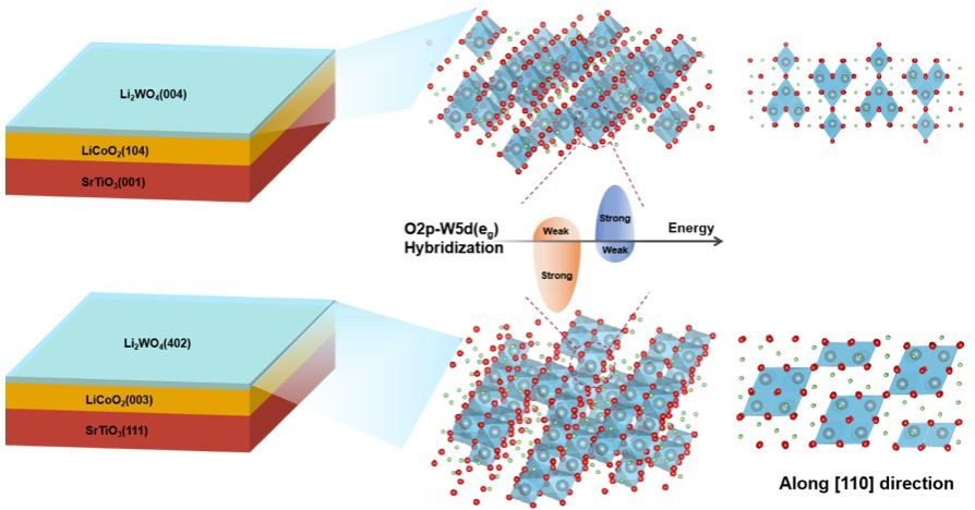 众所周知,氧原子的轨道杂化很难量化,但在工程中却对许多物理化学系统(如电池)至关重要,如电池和电催化等。含锂过渡金属氧化物LiCoO2由于其优良的性能已成为锂离子电池极有前途的正极材料。然而,由于界面反应和结构损坏带来的容量衰减和电压衰减等挑战阻碍了LiCoO2在高压下的性能。通过表面涂层例如过渡金属氧化物薄膜层可以有效缓解这些问题并提高LiCoO2电极的性能。其中,Li2WO4作为一种具有高离子电导率和低电子电导率的固体锂离子电解质被发现可以作为LiCoO2电极的涂层,通过屏蔽电极与液态电解质反应并增强锂离子扩散的方式提高电极性能。然而由于无定形和复杂的界面环境,对Li2WO4特别是单晶薄膜的本质性质研究尚不充分,这可能为锂电池正极界面研究、氧原子的轨道杂化和提高电极性能提供关键线索。
