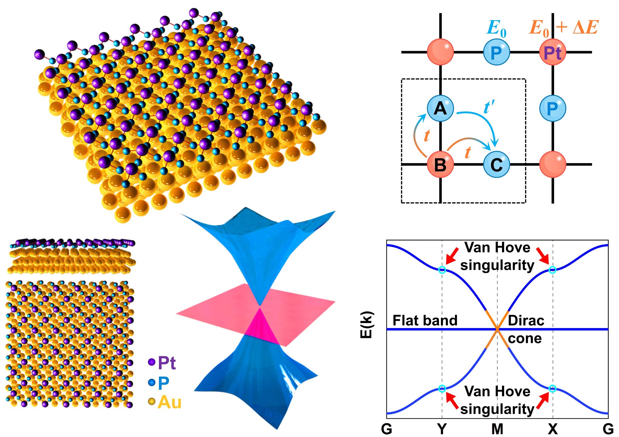 二维Lieb晶格拥有奇妙的电子结构,即一条平带夹在狄拉克锥型能带中间。狄拉克锥可以产生无质量载流子,而平带可以促进非常规超导、分数量子霍尔效应、室温铁磁性、Wigner晶体的形成、激子绝缘态以及激子玻色-爱因斯坦凝聚。因此,特殊晶格结构是研究平带与拓扑的理想平台,包括lieb,kagome晶格等,它们具有一些新奇的电子特性,如平带、狄拉克锥和范霍夫奇点,这些特性使其在电子器件和拓扑催化等领域具有潜在应用价值。然而,由于Lieb晶格体系固有的不稳定性,难以在自然界中天然存在,大量研究主要基于人工系统设计,人们尚未在真实材料中发现Lieb晶格能带结构特征。因此,需要进一步的努力,合成具有高稳定性的新型Lieb晶格,并探索其独特的电子及拓扑特性。