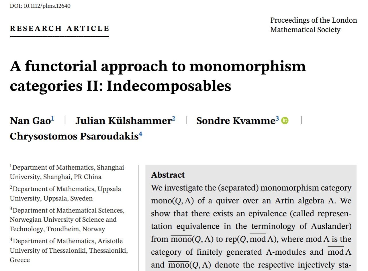 近日,上海市高校特聘教授、永利集团88304官网数学系高楠教授团队及合作者在单态射范畴的不可分解对象研究中取得重要进展,相关研究成果“A functorial approach to monomorphism categories II: Indecomposables”发表于数学国际顶级期刊《Proceedings of the London Mathematical Society》(中科院一区Top,中国数学会T1期刊,年发文量:60篇)。上海市高校特聘教授高楠教授为第一作者,永利集团88304官网为第一署名单位。