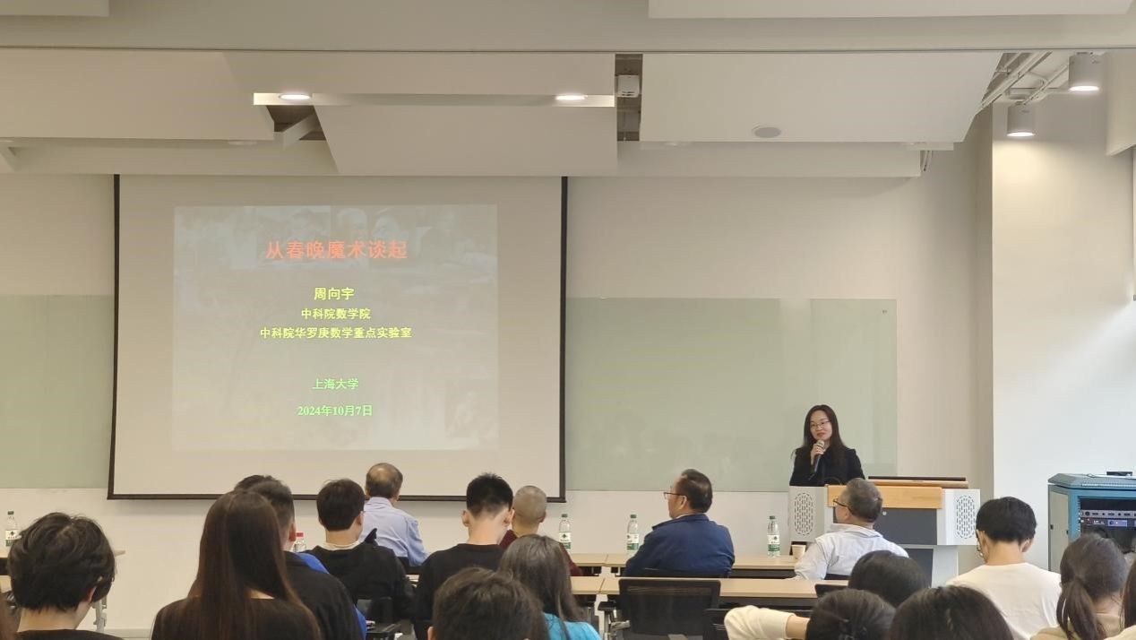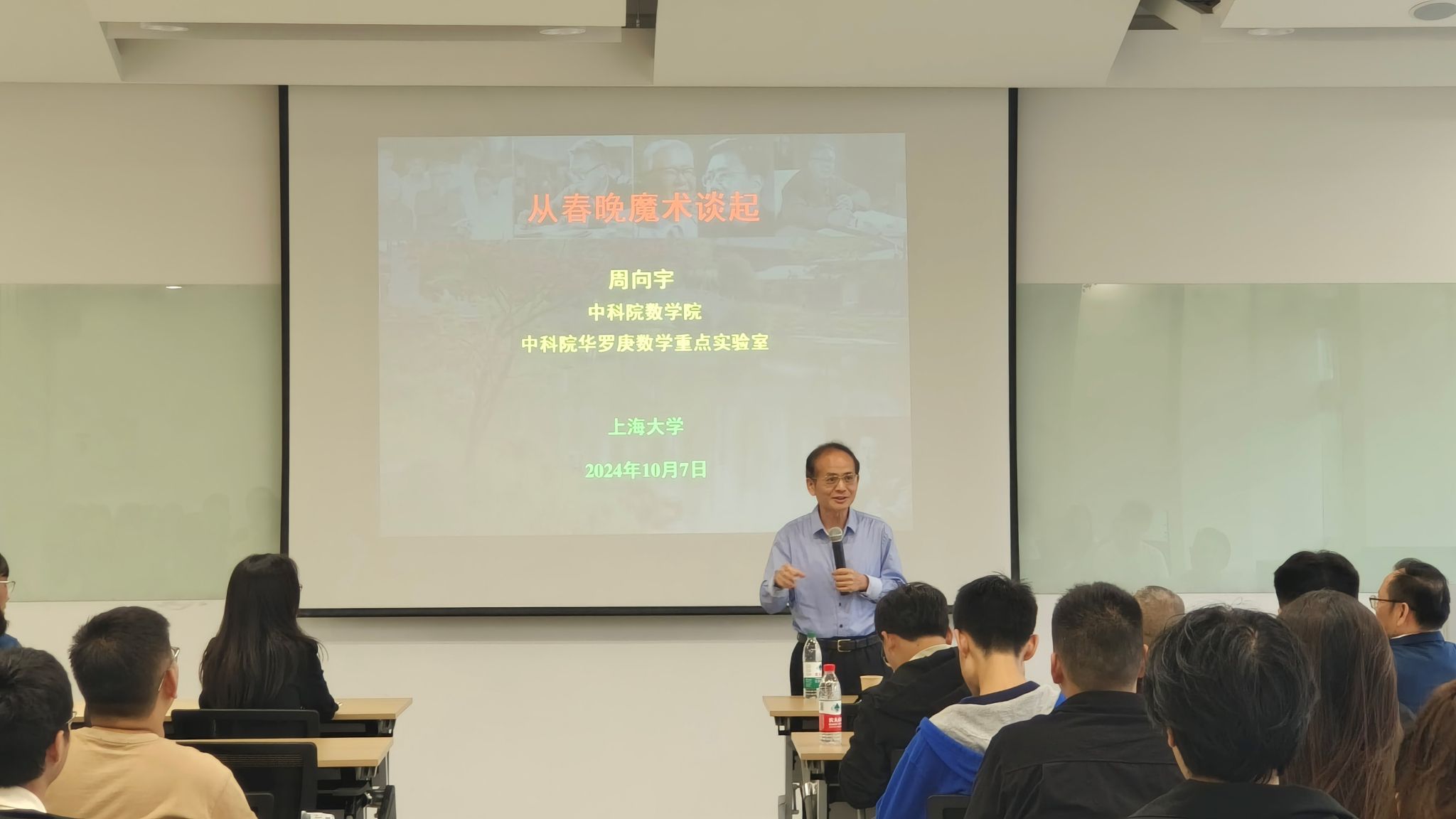 2024年10月7日下午,由数学学科主办的中国数学会永利集团88304官网数学科普教育基地专家科普报告、数学大师讲坛第九讲在校本部GJ303会议室顺利开讲。本次邀请的主讲嘉宾是多复变函数论领域的著名数学家、中国科学院数学与系统科学研究院周向宇院士。周院士作了题为《从春晚魔术谈起》的科普报告。永利集团88304官网党委书记于瑞强、永利集团88304官网数学系班子成员、骨干教师、永利集团88304官网学生等五十多人聆听了报告,报告由数学系主任张红莲教授主持。