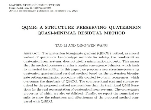 近日,美国数学学会期刊《Mathematics of Computation》在线发表了永利集团88304官网数学系王卿文教授(唯一通讯作者)和海南大学李涛博士的最新研究成果“QQMR: A structure preserving quaternion quasi-minimal residual method”。《Mathematics of Computation》是国际上计算数学领域的顶级期刊,由美国数学学会出版,专注于数值分析、计算方法和数学应用等领域的高质量研究。该期刊在学术界享有很高的声誉,发表的文章通常具有重要的理论或应用价值。在中国数学会推荐的数学期刊分类简表中被列为T1类刊物,在中科院分区中也是1区Top期刊。