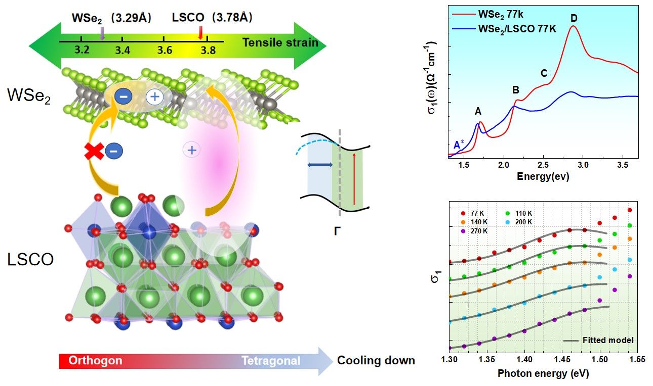 在这项工作中,尹鑫茂教授团队首次对基于铜基超导体的二维异质结材料的光学和电子性质进行了深入探讨。与在其他基底上的单层WSe2不同,最佳掺杂La1.85Sr0.15CuO4(WSe2/LSCO)上的单层WSe2呈现出独特的能带结构。通过高分辨率光谱椭圆偏振法和密度泛函理论计算,发现这种独特的电子结构是由铜基超导体的CuO2平面与WSe2之间的电荷转移所驱动的界面小极化子形成所致。此外,还观察到了LSCO衬底的结构相变会减少WSe2的电子-空穴(e−h)相互作用。这些发现激发未来对界面极化子如何影响铜基超导体超导性的研究,并强调了界面效应对WSe2薄膜电子结构的重要影响。为深入研究界面极化子与超导性的内在关系提供了一种独特的方法。
