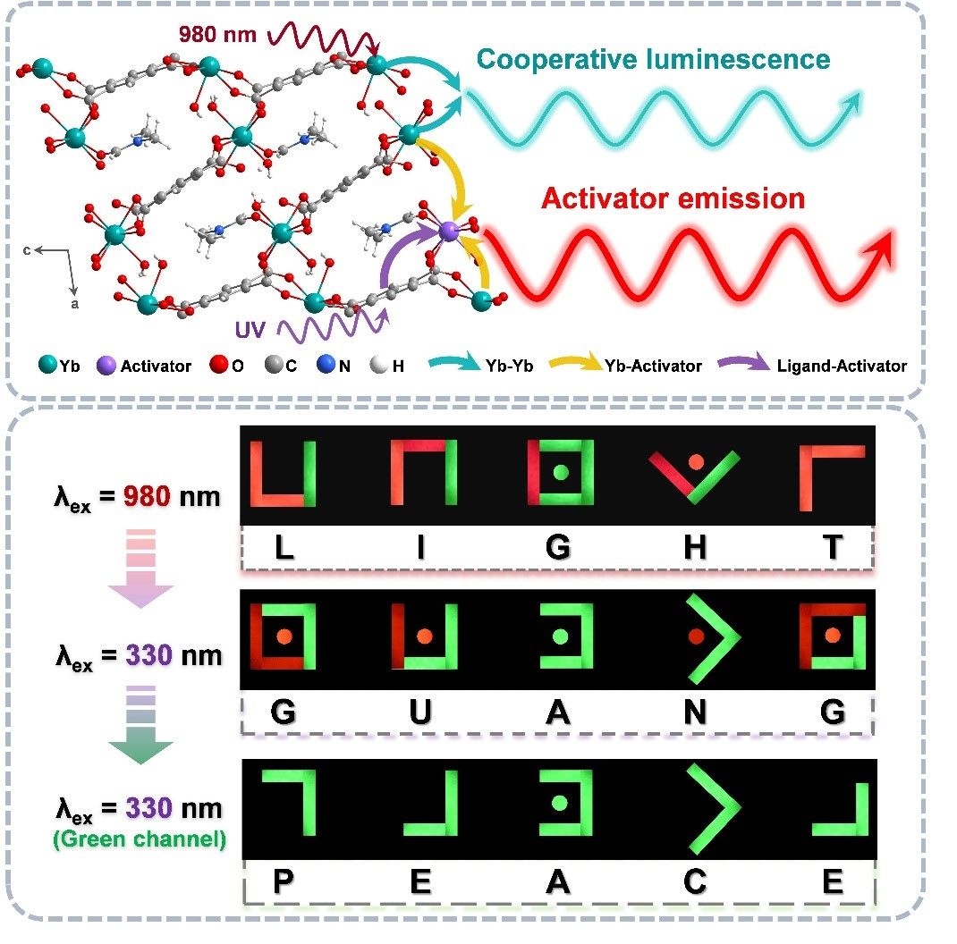 二维发光金属有机框架(2D MOFs)是一类具有层状结构的先进功能材料,因其独特的层状结构和优异的光学性能,在光电器件、传感及信息存储等领域具有巨大的应用前景。然而,现有二维发光MOFs的研究主要集中于下转移发光领域,关于其上转换发光的研究非常稀缺,这使得材料难以响应近红外光等低能量光源,极大限制了其在高端防伪等领域的应用。上转换发光技术能够实现“低能量激发-高能量发射”的反斯托克斯过程,其在生物标记、信息安全等领域具有重要应用价值。