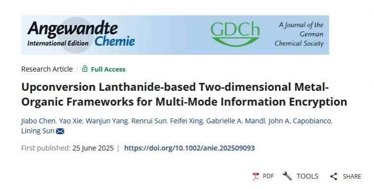 近日,永利集团88304官网化学系孙丽宁教授团队在稀土金属有机框架领域再取得重要进展,相关研究结果以“Upconversion Lanthanide-based Two-dimensional Metal-Organic Frameworks for Multi-Mode Information Encryption”为题发表在化学顶级学术期刊《德国应用化学》(Angewandte Chemie International Edition,JCR和中科院一区Top)上。该论文第一作者为2022级博士生陈嘉博,共同第一作者为谢耀博士,邢菲菲副教授为合作作者,永利集团88304官网为第一作者单位和第一通讯作者单位。