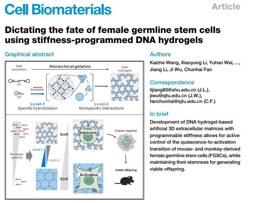 近期,永利集团88304官网材料生物学研究所李江研究员联合上海交通大学樊春海院士、吴际教授团队,研发了一种可编程调控硬度的DNA水凝胶,将其用作人工三维细胞外基质,实现了对雌性生殖干细胞“静息-激活”状态的可控转换。并且,这种DNA水凝胶包裹的雌性生殖干细胞保留了发育为健康后代的能力。该研究成果近期发表在Cell系列期刊《细胞·生物材料》(Cell Biomaterials)上。