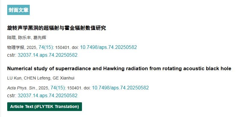 近日,在永利集团88304官网葛先辉教授的指导下,永利集团官网物理系研究生陆琨在类比引力与黑洞物理研究方面取得重要进展。研究成果以题为《旋转声学黑洞的超辐射与霍金辐射数值研究》的论文发表在国内物理学顶级期刊《物理学报》上,并因其创新性和重要性,被选为该期的封面论文。永利集团官网研究生陆琨为论文第一作者,陈乐丰为论文的第二作者,葛先辉教授为通讯作者。