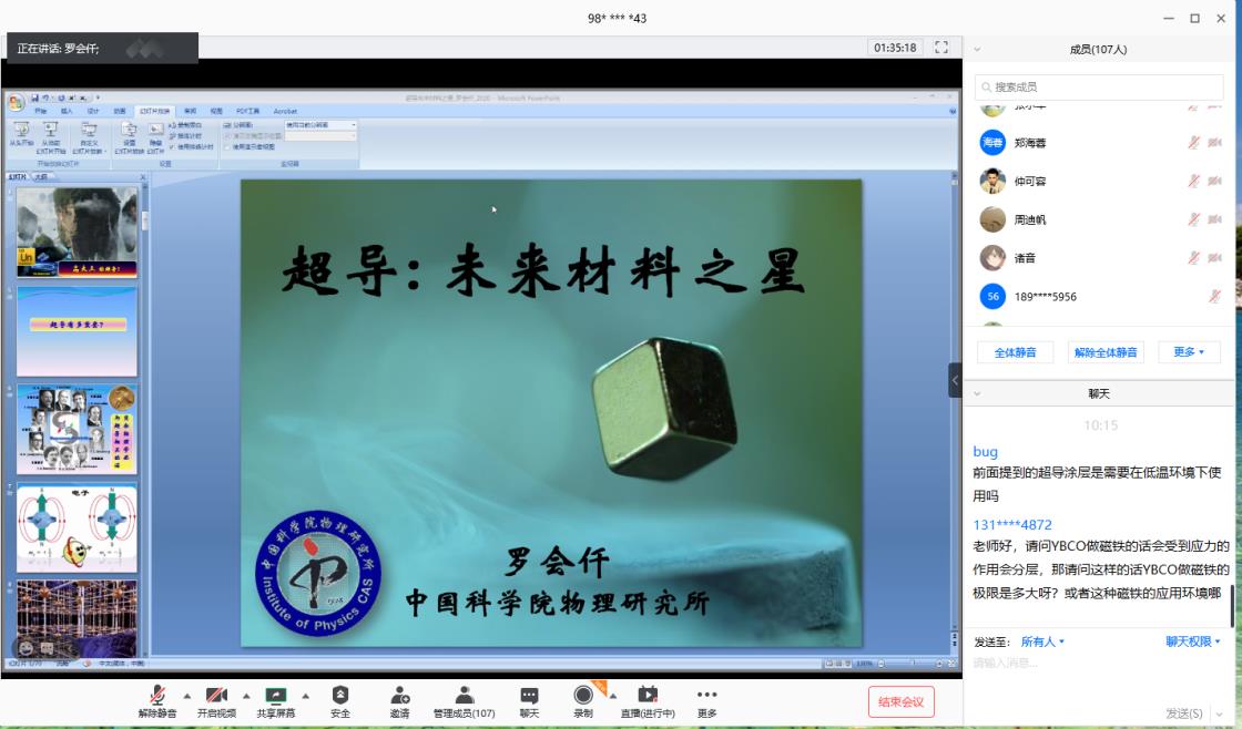 会议开始视频介绍了上海市高温超导重点实验室的发展历程,紧接着实验室主任蔡传兵教授致欢迎辞。本次活动特邀了中科院物理所超导国家重点实验室副研究员、国家自然科学基金优青获得者、中科院青年创新促进会成员罗会仟博士,作了题为“超导-未来材料之星”的讲座。罗老师长期在超导前沿问题研究的同时开展科普工作,代表作有《超导“小时代”》、《水煮超导》,参与《十万个为什么》新版撰写,曾任中央电视台、北京卫视、芒果TV等多档节目科学嘉宾。长期致力于推动超导的公众普及。他的报告用生动形象的语言对超导的特性、分类、应用前景进行了介绍,为大家揭开了超导神秘的面纱,内容丰富有趣,大家听得津津有味,纷纷提问,罗老师均给予了热情回答。