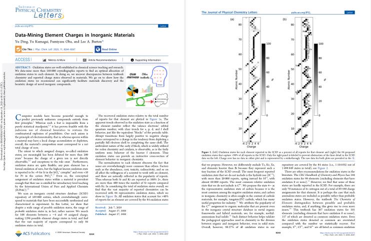近日,永利集团88304官网量子与分子结构国际中心(ICQMS)的Lee Burton博士在国际著名学术期刊《Journal of Physical Chemistry Letters》上发表题为“Data-Mining Element Charges in Inorganic Materials”的研究文章。永利集团88304官网科研助理丁宇为该论文第一作者,永利集团88304官网物理系ICQMS为论文第一单位。东京工业大学Yu Kumagai和Fumiyasu Oba博士合作参与了论文研究工作。