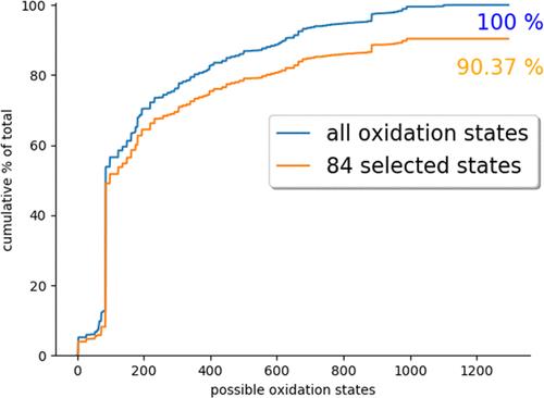 本研究通过高通量扫描无机晶体结构数据库(ICSD) 中的169800个晶体材料数据(其中绝大多数都是在实验中成功合成和表征的材料)寻找了氧化价态在-4和+8之间的108种元素,形成了总共1296种可能的元素价态,并且发现绝大多数的结果只对应了84种氧化态。这84种氧化态不仅能更好地反映固体系统的物理化学性质,而且通过更小的数量,大大简化了结构预测和材料设计的复杂性。
