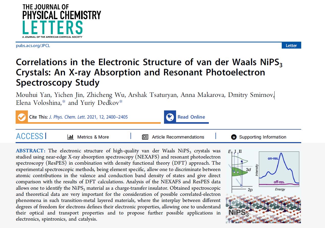 近日,永利集团88304官网量子与分子结构国际中心(ICQMS)“ 2D Systems ”课题组在国际知名期刊《The Journal of Physical Chemistry Letters》(近3年平均影响IF=7.583)上发表了题为 "Correlations in the Electronic Structure of van der Waals NiPS3 Crystals: An Xray Absorption and Resonant Photoelectron Spectroscopy Study"的论文,论文的第一作者为物理系博士研究生颜谋回,通讯作者为物理系Elena Voloshina 教授和 Yuriy Dedkov教授,永利集团88304官网物理系为论文第一单位。