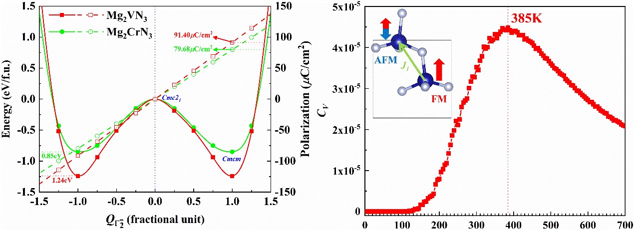 3. 一组同时表现出显著铁电极化和压电响应的氮化物,并预测与V相邻的Cr元素组成的化合物是具有铁磁基态的多铁性材料。