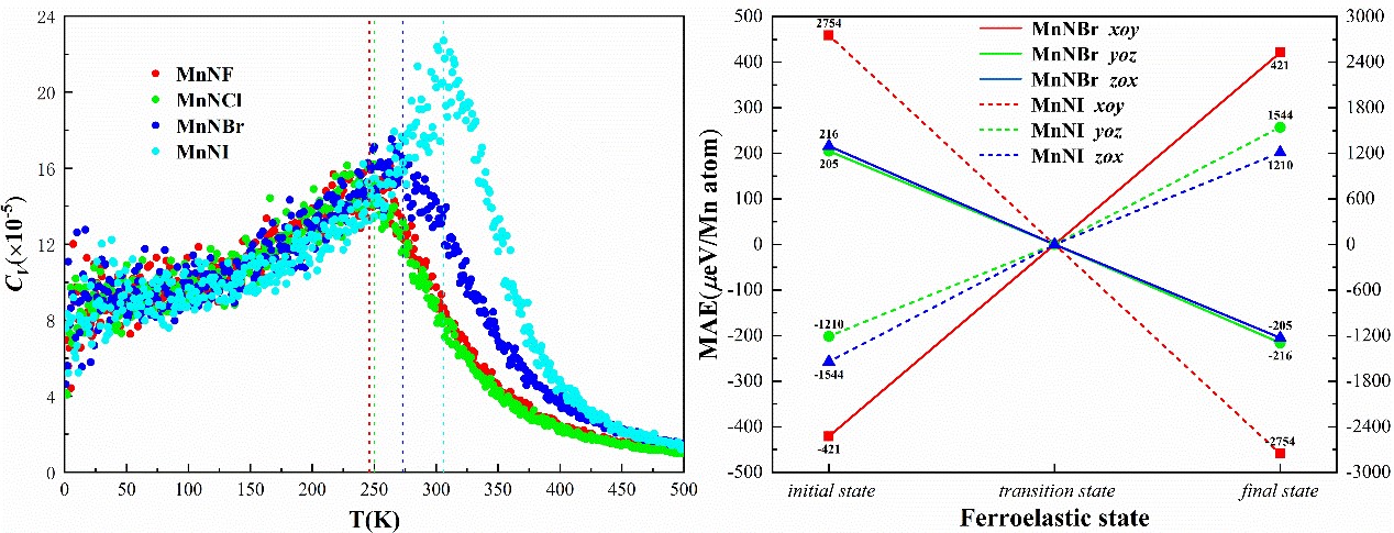2. 一类同时具有室温铁磁性和面内铁弹性的二维多铁过渡金属卤氮化物,通过可逆的单轴面内应变可以调控面内铁磁性转换。
