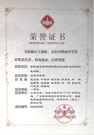 2021年度中国内燃机学会第九届会员代表大会于10月15-17日成功召开。会议期间公布了中国内燃机学会2021年科学技术奖获奖名单。由永利集团88304官网牵头,联合鸿基创能科技(广州)有限公司、广东国鸿氢能科技有限公司、超威集团、畔星科技(浙江)有限公司等单位共同完成的“高性能长寿命燃料电池发动机系统的开发研制”项目荣获自然科学一等奖,永利集团88304官网可持续能源研究院张久俊院士为该奖项第一获奖人,赵宏滨教授、李爱军教授、刘杨博士等为该项目的共同获奖人。